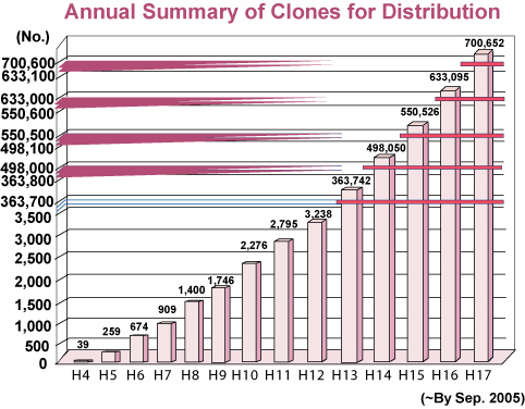 Recently, with the accumulation of genetic information, there has been a shift in research trends such as using in silico cloning instead of the conventional method of isolating genes by hybridization from gene libraries. In keeping up with this trend, our division has been making the transition from a bank that simply supplies gene fragments to one that provides high-value added genetic resources. Moreover, during this year, not only the domestic utilization of genetic resources but also the international distribution requests of these resources have increased dramatically. Furthermore, introductory articles on our bank were published in Science (vol. 307, p. 1722, 2005), BioTechniques (vol. 38, p. 21, 2005), and J. Gene Med. (vol. 7, pp. 1148-1157, 2005), and we believe that our bank is being acknowledged all over the world.