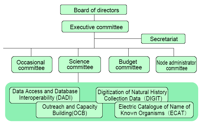 Under the governing board and the executive committee, the GBIF has 3 standing committees which consist of the Science Committee, the Budget Committee, and the Node Managers Committee, and an ad-hoc committee which consists of the Membership Committee (Fig. 1). As a result of an international bid in 2001, the Secretariat as shown on the right side of Fig. 1 is hosted by the Zoological Museum, University of Copenhagen. Dr. James Edwards, who was part of the OECD Working Group, remains with the U.S. National Science Foundation while continuously leading GBIF as the Executive Secretary. There are four subcommittees under the Science Committee which are the DADI, DIGIT, ECAT, and OCB.