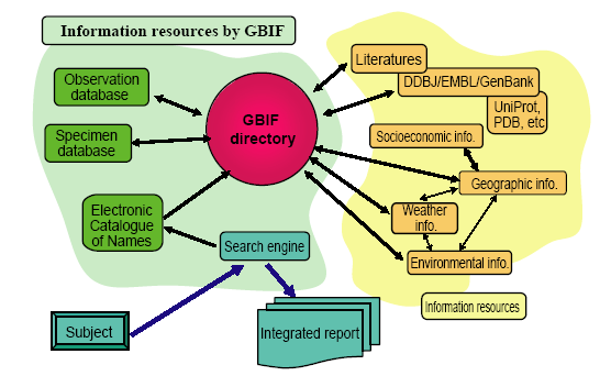In contrast, when the solution to biodiversity problems offered by GBIF is fully developed, primary data can be integrated efficiently and easily obtained as shown in Fig. 2. After the subject is entered into the search engine, as shown on the bottom left in Fig. 2, the search engine refers to its scientific name (ECAT), then using the GBIF directory, collects specimen and base sequence data from DDBJ/EMBL/GenBank (http://www.insdc.org/), geographicalinformation, socioeconomic information and ecological information, and returns an integrated report.