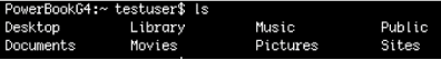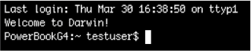 1. Double click on Macintosh HD, followed by Application, and then Terminal in that order to launch the terminal window. A screen similar to one shown below should pop up (The testuser is the user name and it will be different on your computer. Hereafter, please replace testuser with your own user name).