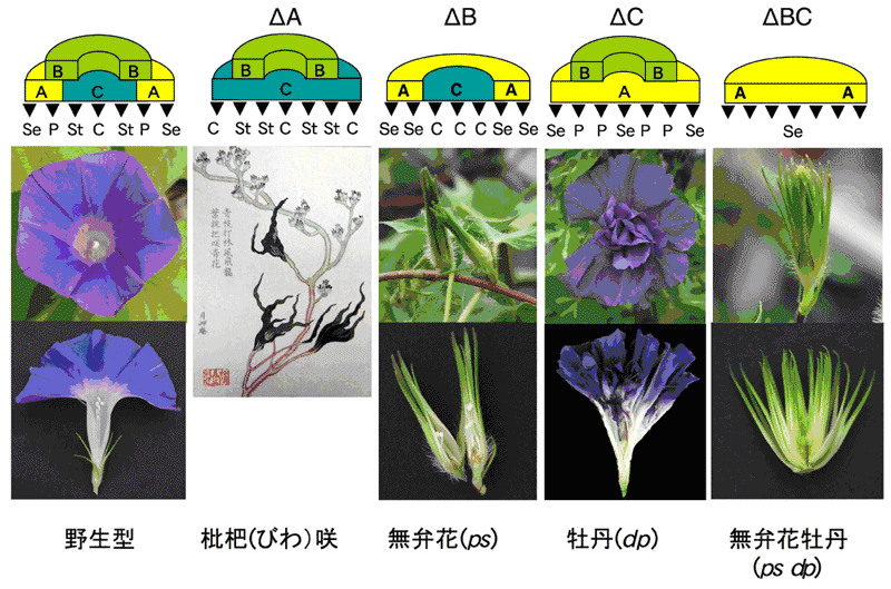 Fig. 5: Mutants Related to Floral Organs. Mutant genes corresponding to each mutant gene in the well-known ABC model of floral organogenesis are also observed in asagao.