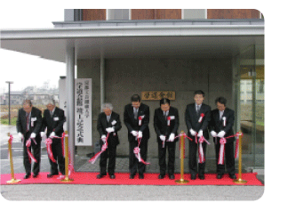 Ribbon cutting at the completion ceremony of the Gakudo Hall.Kazuto Hatsuyama, President, Nippon Shinyaku, Co., Ltd. (center); Mr. Shigeru Kure, Director of Genome Research, Life Science Division, Ministry of Education, Culture, Sports, Science &Technology (MEXT) (right of the center); Yoshimichi Ejima, President of the Kyoto Institute of Technology (left of the center)