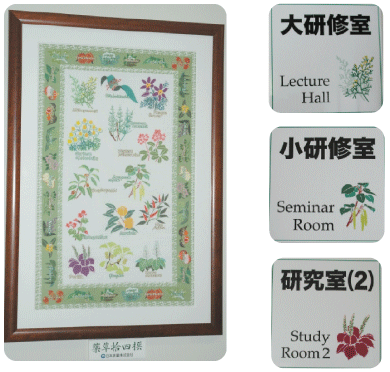 A tablecloth with the designs of the 14 selected herbs on it, and the room identification plates placed in Gakudo Hall; these were manufactured for the 80th foundation anniversary of Nippon Shinyaku Co., Ltd. |