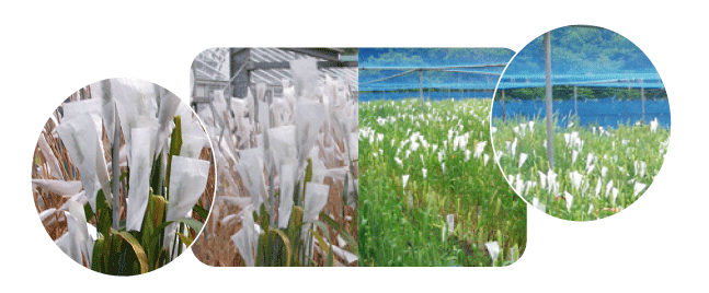 A scenic picture showing the covering of wheat ears with paraffin bags to preserve the wheat strains. Left: the Greenhouse of the Graduate School of Agriculture, Kyoto University. Right: the Farm field of the Faculty of Agriculture, Tottori University. Although the cultivated wheat is self-fertilized, fertilization by the pollens of other strains is prevented by covering the wheat ears with paraffin bags prior to bloom. The wheat crop should be covered with a net to prevent sparrows from feeding on them. |