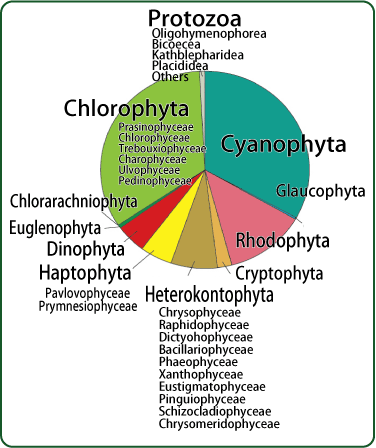 The proportions of 10 phyla of algae and protozoa are indicated in the pie chart. For the phyla containing multiple classes, the class names are indicated under the phylum names.