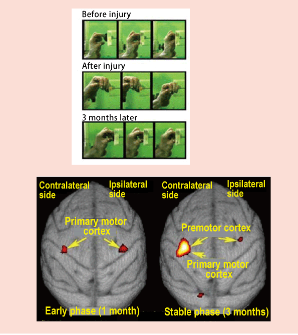 Fig. 1: The recovery process after spinal cord injury (left) and brain activity during early recovery phase (1 month after injury) and plateau phase of recovery (3 months after injury) of fingers. The activity of the primary motor cortex on both sides increased in the early phase, and the activity of an extensive region of the primary motor cortex on the contralateral side of the injury and the premotor cortex on both sides also increased (Isa, et al., Science 2007).