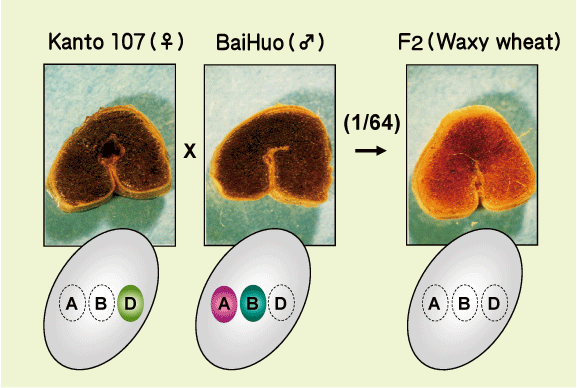 Fig. 1: Development of waxy wheat. Among the 3 redundant GBSSIs (Wx proteins) found in the endosperm, the GBSSIs derived from the A- and B-genomes are lost in the Kanto 107 strain in Japan and the GBSSI derived from the D-genome is lost in the Hakubi (BaiHuo) strain in China.