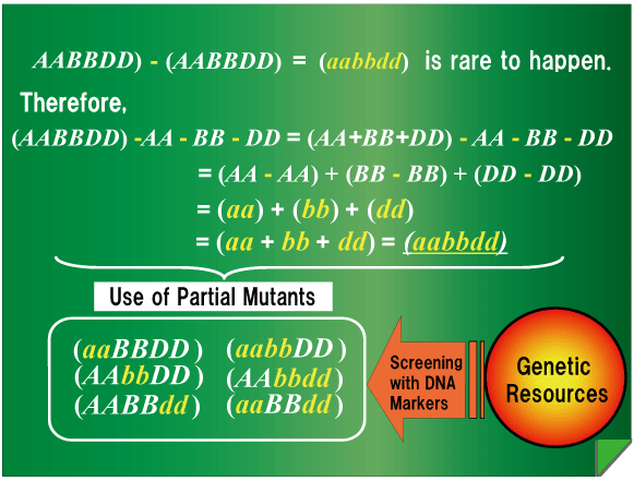 "-(AABBDD) " represents simultaneous mutation of the 3 genes, which, if observed, will be noted as (aabbdd). However, the probability that this event will occur is extremely low. Since each gene is mutually independent, the 3 genes are considered as "(AA + BB + DD)," and the mutation of each gene is then described as "-AA -BB -DD." Hence, the formula can be rewritten as "(AA - AA) + (BB - BB) + (DD - DD)," which is equivalent to "(aa + bb + dd)." In this manner, we screened for mutants in which the homologs were mutated and crossbred these mutant strains.
