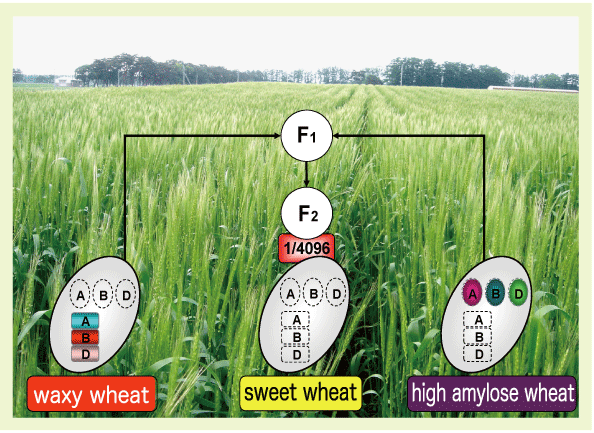 If waxy wheat (Fig. 1) and the wheat strain with high amylose content, which lacks the 3 soluble starch synthases (starch synthase IIa enclosed by rectangles) derived from the A-, B-, and D-genomes, are crossbred, a double mutant that completely lacks both the GBSSIs and soluble starch synthases (sweet wheat strain) can be produced with a probability of 1/4096 in the F2 generation.