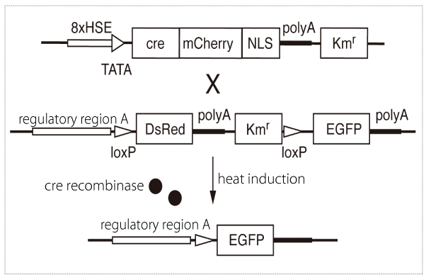 Without the cre recombinase, DsRed expression is activated by regulatory region A. After heat induction, the sequence flanked by the loxP will be excised via cre recombinase, and EGFP expression will be initiated. |