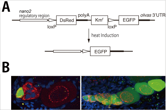 First, the sequence flanked by loxP was excised via heat treatment, and green fluorescence was observed in nano2-expressing cells. In addition, when the green fluorescence was traced, the eggs continuously emitted green fluorescence for 3 months; thus, Nakamura et al. successfully showed for the first time that vertebrate ovaries contain nano2-expressing germ stem cells2).