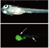 (A) Bright-field image of medaka and (B) induced EGFP observed in muscle and bowel tissues, as indicated by arrows. |