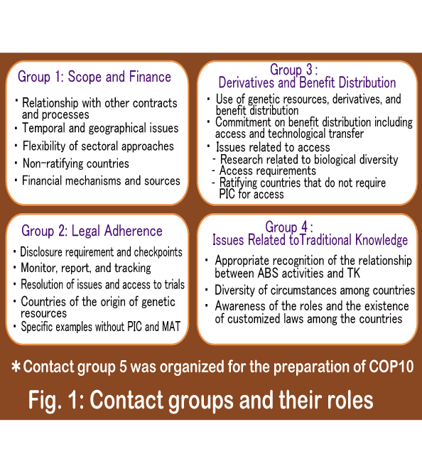 The co-chairs emphasized at the first plenary session that only 7 days remained for discussing and finalizing the protocol before COP10 is held in Nagoya and stated that the Cali meeting would aim at finalizing the draft protocol. The problems faced in each country were presented in the afternoon, and 4 contact groups (later 5 groups, including an additional group for the preparation of COP10) were formed on the basis of the issues. The first group is responsible for the scope and finance; the second group, the issues related to legal adherence; the third group, the sharing of derivatives and distribution of benefits; and the fourth group, the traditional knowledge (TK) (Fig. 1). Group discussions were conducted from the afternoon of the second day until the night of the fourth day, and an interregional group (IG) meeting was organized on the fifth and sixth days (Picture 2).