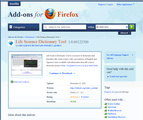 Fig. 1: Life Science Dictionary Tool Firefox Add-on Website