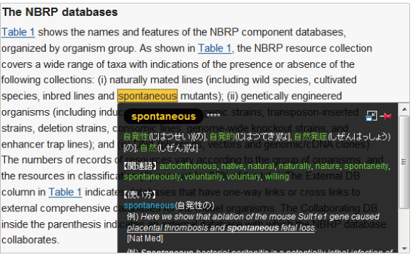Fig. 3: Meaning and usage of the word "spontaneous" appearing in the article "NBRP databases: Database of biological resources in Japan." |