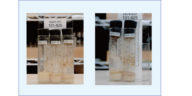 As of July 2010, a total of 26,000 strains are being maintained at DGRC. One set of Drosophila strains is maintained in 3 breeding bottles per strain and another set in 2 bottles per strain. In this manner, the 2 sets of Drosophila strains are being preserved in 2 isolated breeding rooms to avoid the possibility of simultaneous losses caused by fire or an earthquake and with the consideration of safety as the first priority. Each bottle contains approximately 100 adult Drosophila; thus, the center has 26,000 strains × 5 bottles/strain × 100 flies/bottle = - 13 million flies in total. We have also been maintaining an additional 2 million or more flies for research purposes at the center. Most of these Drosophila strains are pure lines and are genetically well-conserved, mutant Drosophila strains for research use. In addition, strains that are more important are doubly maintained at DGRC and a Drosophila strain center in the US (Photo 1). |