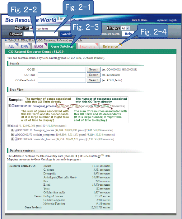 Through BRW, we currently provide 4 types of services: keyword search (Figs. 1-D and 2-1), DNA sequence–based homology search (Fig. 2-2), search by gene ontology (GO) (Fig. 2-3), and references search (Fig. 2-4). Although we are still in the process of collecting information for the GO and references search and available information is considered inadequate, the usability of these services can probably be expanded to a great extent in the future for the following reasons. For example, keyword search is often ineffective for finding 2 or more genes that have the same function but are named differently depending on the species; however, the GO search in which such genes are tagged with a single ID that represents their common function (or meaning) allows users to search genes with a common function by using any of the gene names for these genes from among the organisms contained in the database.