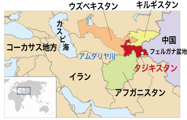 タジキスタンはヒマラヤ山脈の西端に位置し、南にアフガニスタン、西にウズベキスタン、北にキルギスタン、東は中国に接する山国である。タジキスタンは民族および文化の面から、アフガニスタンおよびイランの影響を強く受けているが、ソビエト時代は中央アジア最南端の領土であった。また、1990年代の内戦の影響で、中央アジアでも最も貧しい国とされている。国土の50%以上は3,000mを超える山岳地帯で、国土の南半分はパミール高原と呼ばれ、民族的、文化的にも他の地域とは異なっている。比較的大規模な農耕が可能な地域は、北部のフェルガナ盆地周辺の低地と、南部のアムダリヤ川支流周辺である。 |