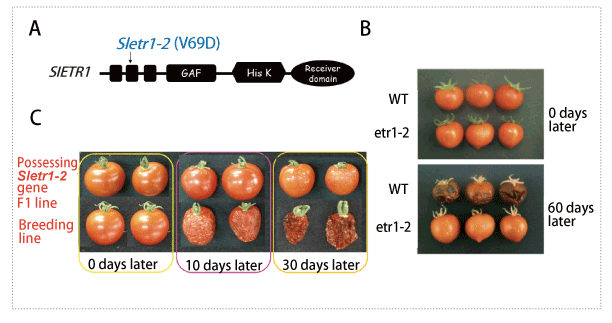 B : Comparison of the shelf life between a mutant (Sletr1-2) and an original line(WT)
