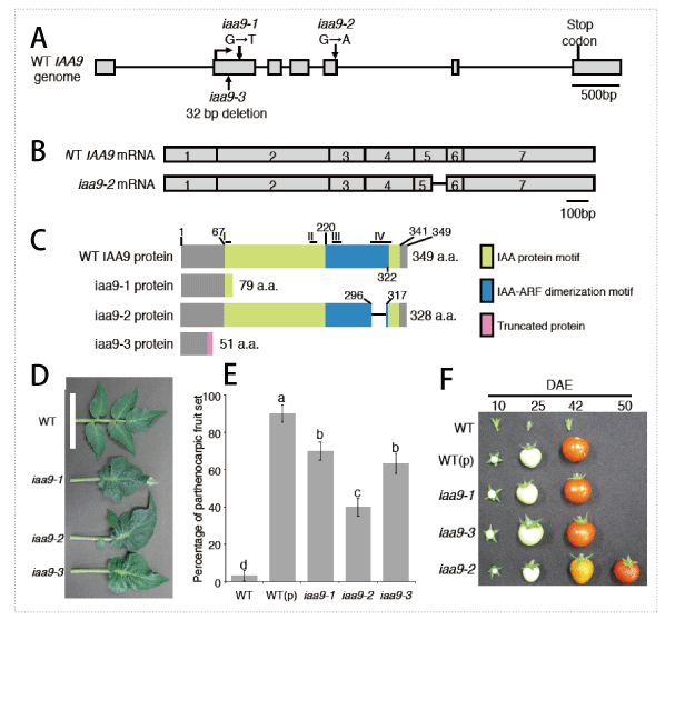 Figure 2: Selection of Micro-Tom parthenocarpic mutants A, B, C: IAA9 genetic variations of mutants(iaa9-1, -2, -3)