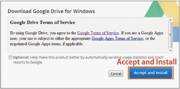 2) We will use the Windows version as an example. Clicking on the [Download Google Drive] button will take you to a page displaying the Terms of Service. Click on the [Accept and Install] button after carefully reading the terms (Fig. 2).