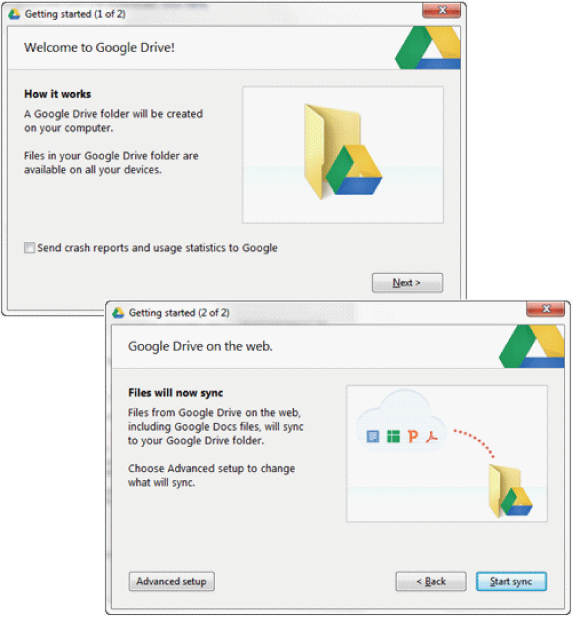 1) Install Google Drive from the following URL: https://www.google.com/intl/en/drive/start/download.html