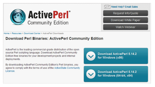 Download and install the Perl execution environment from ActivePerl. Select "Windows x86" if a 32-bit version of Windows is used, and select "Windows 64-bit, x64" if a 64-bit version is used.