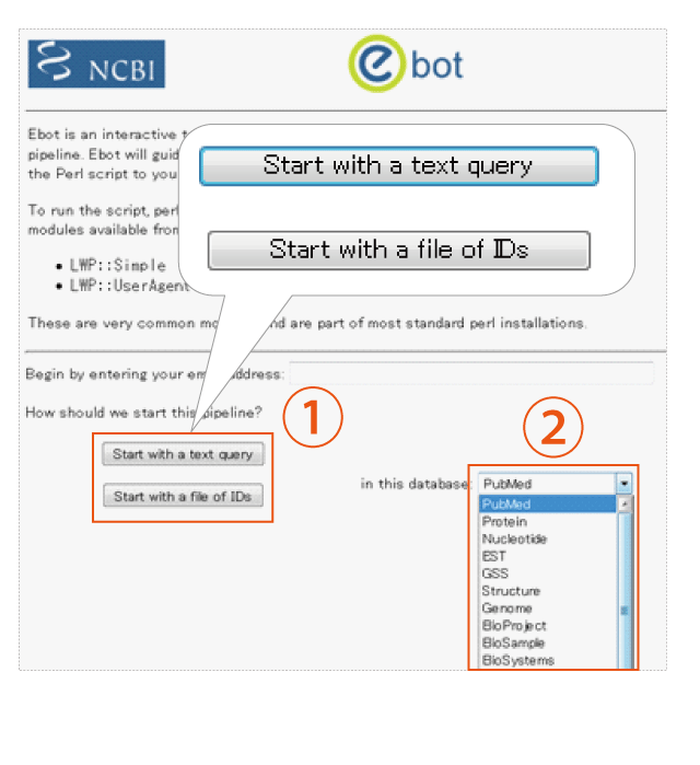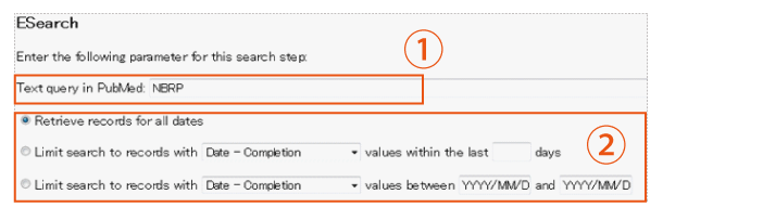 Regarding the search query method, users can select either to directly specify the search query or to upload a file for query (Fig. 2-①). Only one search target server can be selected per search. Users can write scripts that target not only PubMed, but also the other databases such as "Protein," "Nucleotide," and "EST" (Fig.2-②). |