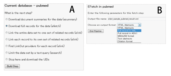 Fig. 4: The output content selection page (A) and output format selection page (B) |