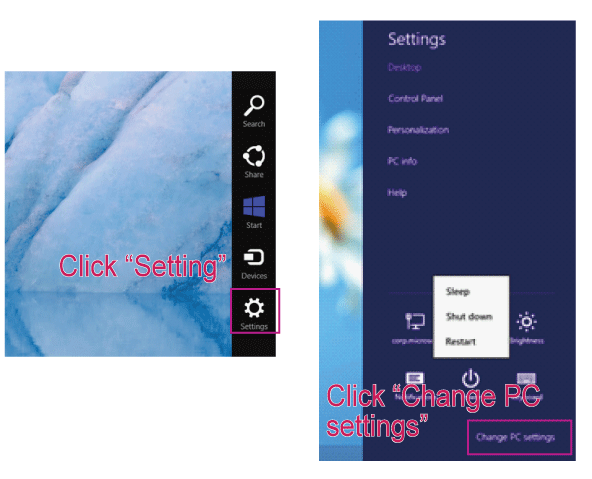 1) Swipe your finger from the right edge of the screen to the left; the Charms bar appears subsequently. Tap "Setting," and then tap "Change PC settings" ( Fig.1). Tap "Change PC settings" again ( Fig.2)