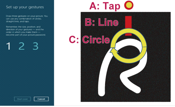 The direction and size of your gesture become part of the picture password. You might want to make use of the outline and position of the images when drawing your gesture.
