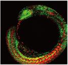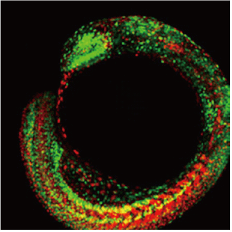The embryonic development of zebrafish can be investigated by using the Fucci method that was developed by Dr. Atsushi Miyawaki. In this method, nuclei of cells in the G1 stage exhibit orange fluorescence and nuclei in cells in the S/G2/M stage exhibit green fluorescence. The cell division can be observed by using the change in the fluorescent color. In the period between April 2009 and June 2012, 182 zebrafish strains were distributed to foreign and domestic researchers. |