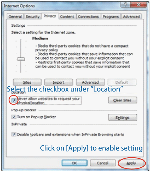 Fig. 1: IE 9 setting for disallowing websites from requesting your physical location