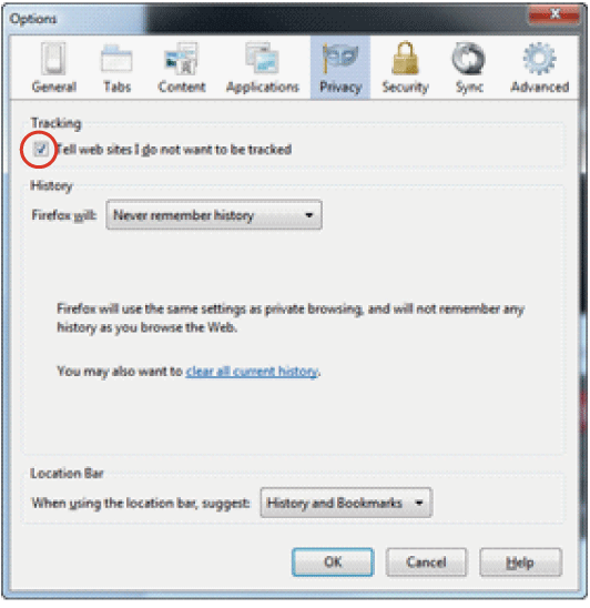 To disallow geolocation requests in Firefox, select the checkbox next to “Tell web sites I do not want to be tracked” in the “Tracking” section of the privacy settings and click on [OK] (Fig. 2).