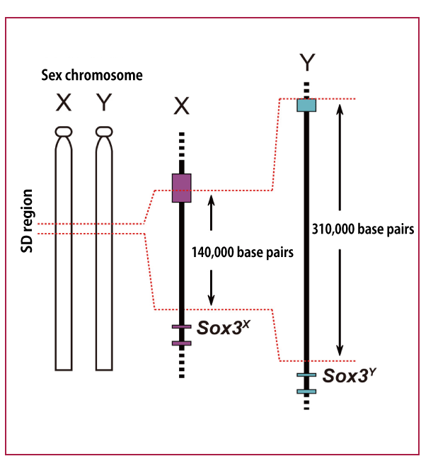 The SD region that is involved in sex determination consists of 140,000 base pairs on the X chromosome and 310,000 base pairs on the Y chromosome. The Sox3 gene exists near the SD region. The Sox3 gene exists on both the X (Sox3X) and Y (Sox3Y) chromosomes, with both chromosomes having the same amino acid sequence.
