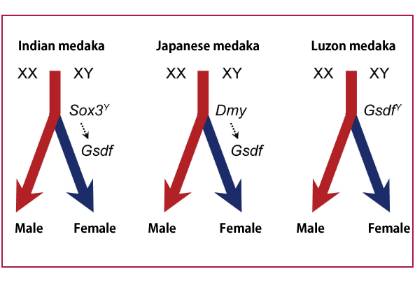Three species from the genus Oryzias (i.e., the Indian medaka, the Japanese medaka, and the Luzon medaka) possess different male-determining genes (Sox3Y, Dmy, and GsdfY). However, the Gsdf gene is highly expressed in XY individuals of all three species. In the Indian medaka, the Sox3Y gene is assumed to control the expression of the Gsdf gene (which was located below the Sox3Y gene), resulting in the generation of a new sex-determination mechanism.