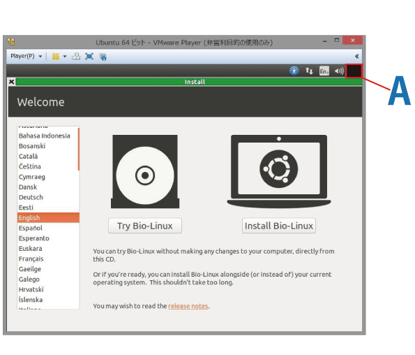 5. In the screen that is displayed after launching the virtual machine, click on [Install Bio-Linux] to begin installing Bio-Linux (Fig.4).