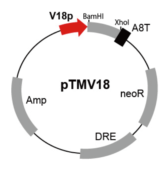 Fig. 2. Vector map of pTMV18 (G90126). This vector contains the V18 promoter for induction of gene expression during the proliferation stage. Numerous cellular slime mold expression vectors are suitable for gene expression during the developmental stage. |