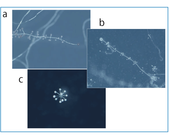 a: Polysphondylium tenuissimum, b: Polysphondylium violaceum, c: Dictyostelium polycephalum