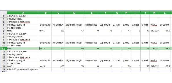 The search result will be output to a file. You can open the tab-delimited output file using spreadsheet software such as LibreOffice Calc ((Fig. 1-②, a program that is equivalent to Microsoft Excel, which is installed with Bio-Linux) for better readability (Fig. 2). |
