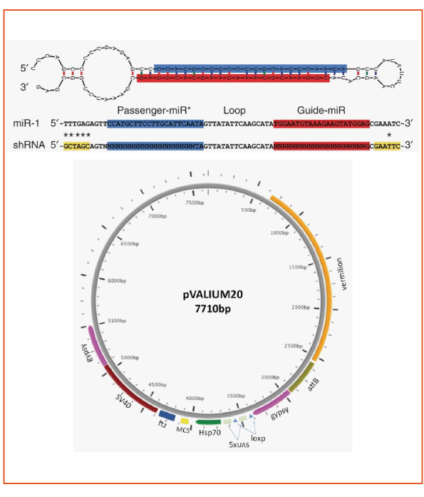 The upper drawing shows the layout of shRNA in the skeleton of the microRNA. The vector uses the vermilion + gene (orange) as a selective marker and possesses gypsy insulators (purple) on both sides. To control the expression level in the GAL4-UAS system, one of two 5xUASs (white) may be removed using the Cre/loxP method.