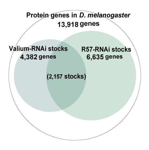 To exhibit TRiP stocks, the 21-bp sequence was searched in the latest genome annotation data to confirm which mRNA was targeted in the target gene and its multiple transcriptional products. In summary, 8,860 genes were able to use the RNAi stocks. Out of the 8,860 genes, 2,157 genes were able to use both R57-RNAi and Valium-RNAi stocks (Fig. 2). At present, the NIG Center for Information Biology is creating a website for these genes, and will be open to the public soon.