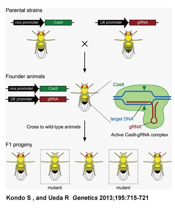 When a fly in which Cas9 is expressed in reproductive cells by the nanos promoter and a fly that expresses guideRNA in all cells are crossbred (the upper part), the target gene is mutated in the reproductive cells of the next generation (the middle part), and, consequently, mutants appear at high frequencies in the F1 progenies (the bottom part). Since the white gene on the X chromosome is targeted in this figure, a phenotype directly appears in the males of the F1 progenies. |