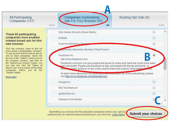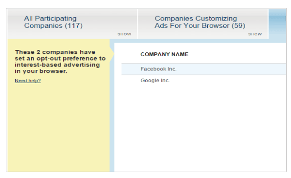 - From the above URL, click on the tab titled [Companies Customizing Ads For Your Browser](Fig. 2-A).