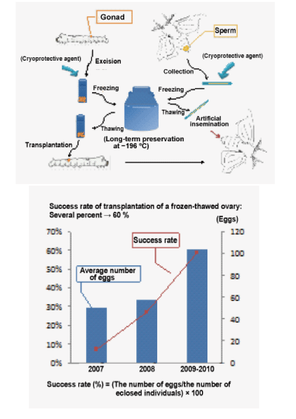 - Only hybrid strains had been used for the development of ovary cryopreservation technologies until 2010. A hybrid strain is obtained by mating two different strains, and it possesses strong vitality because of heterosis effects. However, if the developed technology cannot be used to preserve strains other than hybrid strains, the developed technology is useless for strain preservation. Therefore, we investigated the number of eggs and the success rate after cryopreservation and thawing of 500 strains (core resources) with different histories and origins. At present, approximately 50% of the strains can be cryopreserved for a long period using the developed technology.