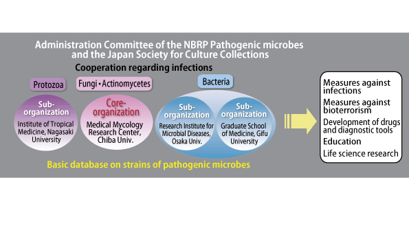 The global increase of multiple-drug resistant pathogens, emerging infections, and bioterrorism has made measures to combat infectious diseases more necessary than ever. The research and development of new diagnostic tools and antimicrobial drugs requires the isolation of novel pathogenic microorganisms. New pathogenic strains are also required for research and education on infectious diseases. Therefore, the National BioResource Project (NBRP) Pathogenic microbes focuses on collecting, preserving, and distributing pathogenic bacteria, fungi (including actinomycetes), and protozoa to facilitate such research.