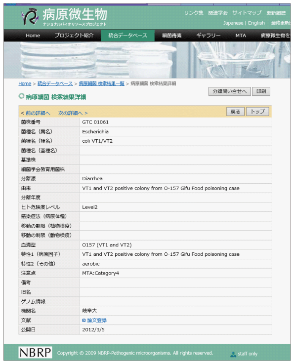 In 2013, an advisory committee was established by the Japanese Society for Bacteriology. The focus of the committee is to discuss the development of a new database that will house a collection of pathogenic bacteria in the NBRP, used in the creation of attenuated strains for vaccine development and education. In cooperation with strain-distributing organizations belonging to the Japanese Society for Bacteriology, the committee will assign Japan National Bioresource of Bacterial Pathogen (JNBP) numbers to all project strains in Japan. In the future, the "Pathogenic microbes" project will manage information about strains using the JNBP numbers. The NBRP "Pathogenic microbes" database will also collect user feedback regarding the collection of clinical and environmental isolates, as well as requests for the acquisition of new type strains. |