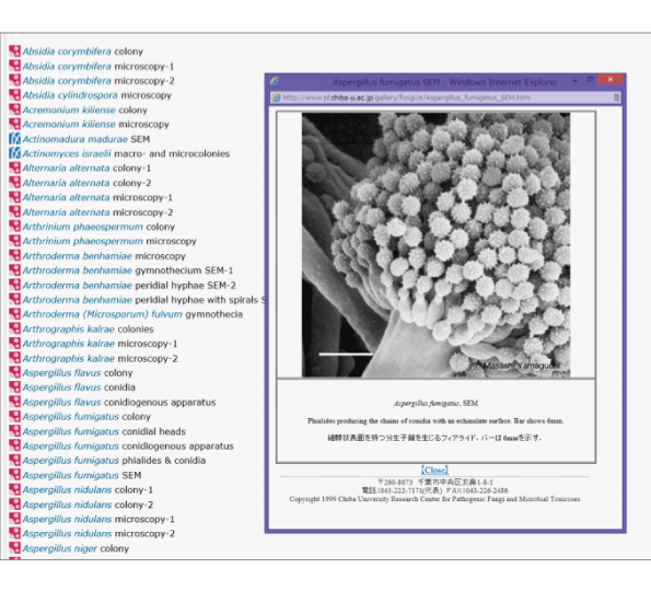 As a public relations exercise, the Fungus and Actinomycetes Gallery was created and is available on the homepage of the Medical Mycology Research Center, Chiba University. The gallery contains images of fungi and actinomycetes colonies observed under a light or electron microscope together with mycological explanations. You are welcome to use this gallery for education at the following website;