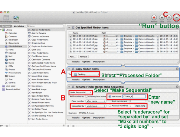 ⑤ Next, in the central window on the right panel entitled "Copy Finder Items," specify "Processed Folder" (created in Step 1) in the "To" dropdown list ( Fig. 2-A). Then, in the bottom window entitled "Rename Finder Items," click on "Make Sequential," check the "new name" radio button, and type "STRAIN_A," as the name of the strain. Choose "underscore" in the "separated by" field and set "make all numbers" to "3 digits long" (Fig. 2-B).