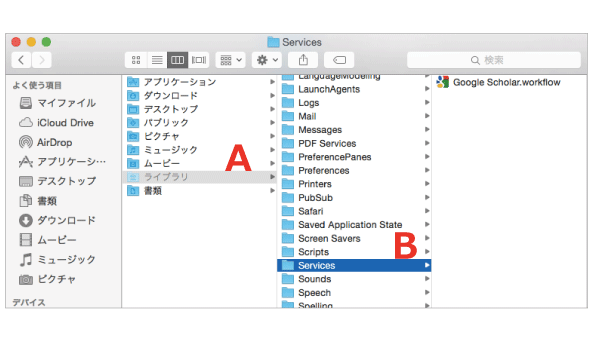 2. 2. Click on the “Go” menu from Finder, press [option] key while the menu is still being displayed, and the “Library” menu item will appear. Select this menu (Fig. 2A) to go to the Library folder. Next, copy the "Google Scholoar.workflow" file that you have just downloaded folder into the "Services" folder inside the “Library” folder (Fig. 2B). This ends the preparation step.
